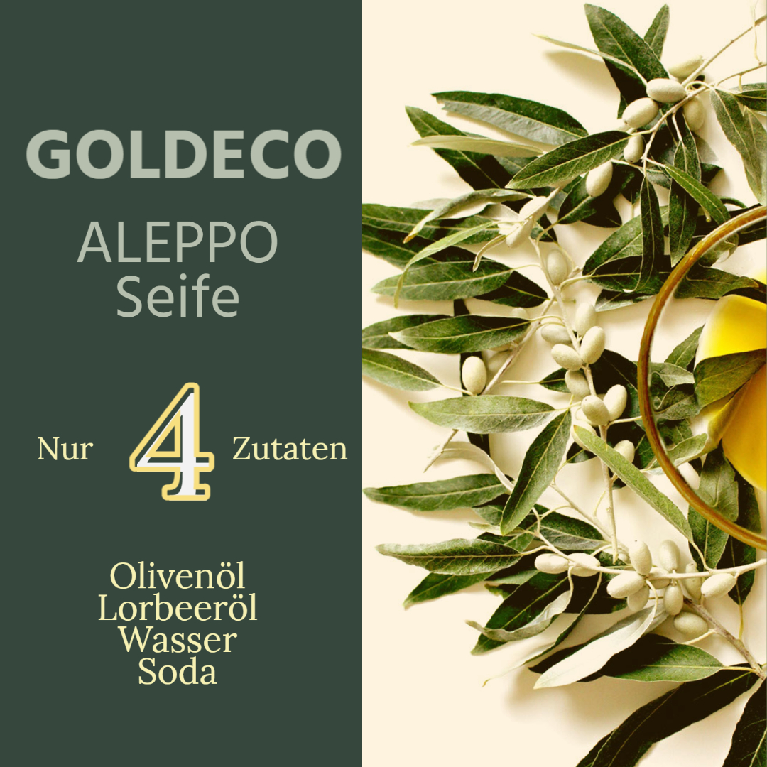 Goldeco Aleppo Soap gilt als die älteste Seife der Welt und wird traditionell durch ein Heißsiedeverfahren, aus Olivenöl, Lorbeeröl, Wasser und Natriumhydroxid hergestellt. Ihre bewährte Rezeptur wird bis heute geheim gehalten und von Generation zu Generation weitergegeben. Die Seife eigent sich für alle Haut- und Haartypen und kann von der Haarwäsche bis hin zur Gesichts- & Körperreinigung verwendet werden.